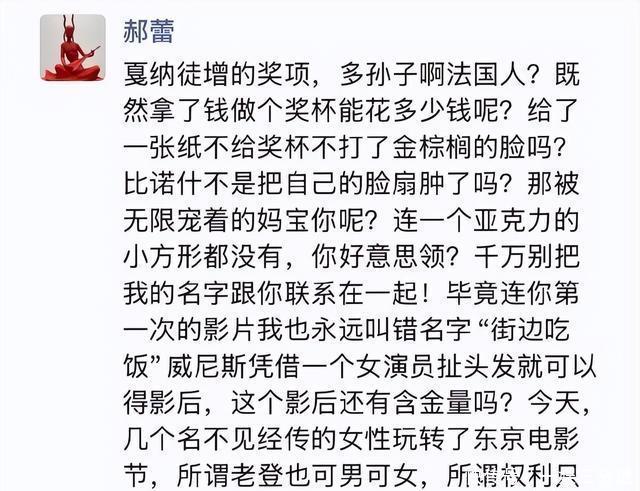 这个时候肯定会有人说了,郝蕾虽然没有拿到过影后,但她的演技很好,既然如此,那大家能说出几部郝蕾的代表作吗?应该没人能说出来吧,就这么说吧,郝蕾唯一的代表作是《夏宫》,但这部作品因为题材受限无法公映,所以,年轻观众对郝蕾的认知就只有综艺节目的导师,可能也正是因为导师当久了,郝蕾直接飘了,其实她和影后从来没有关系。