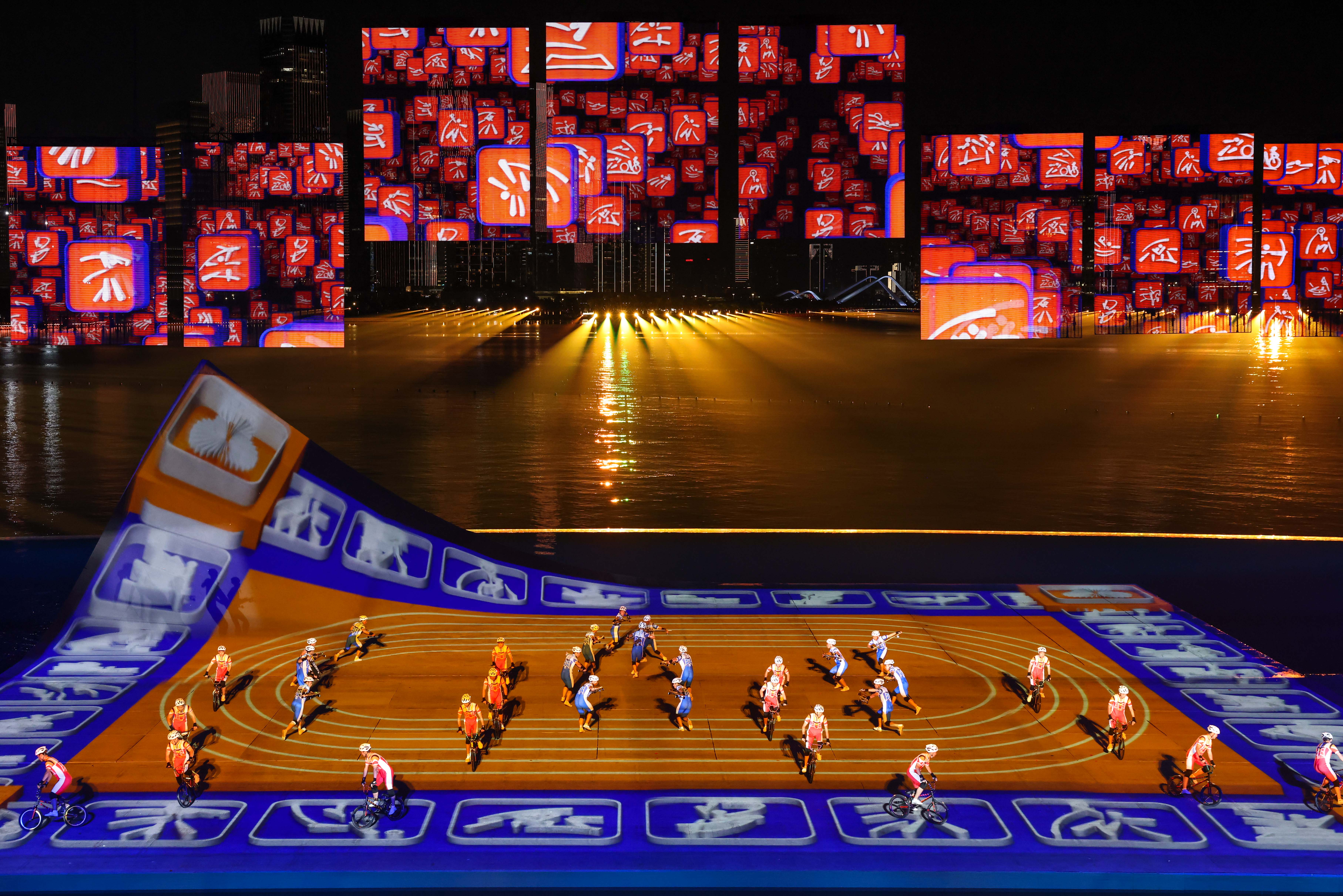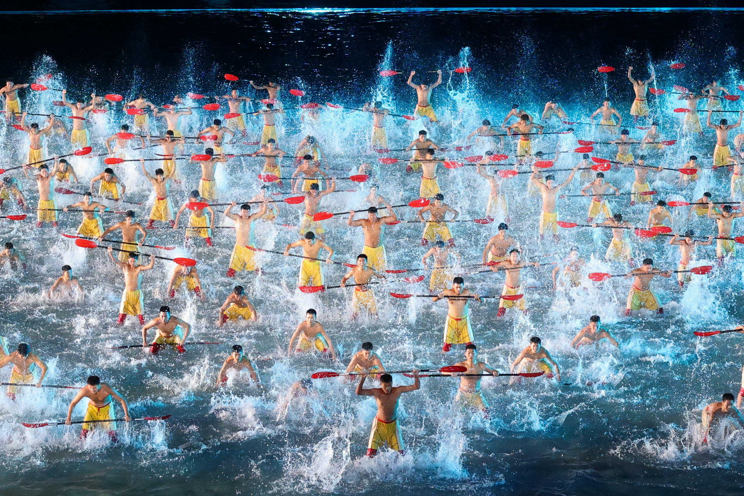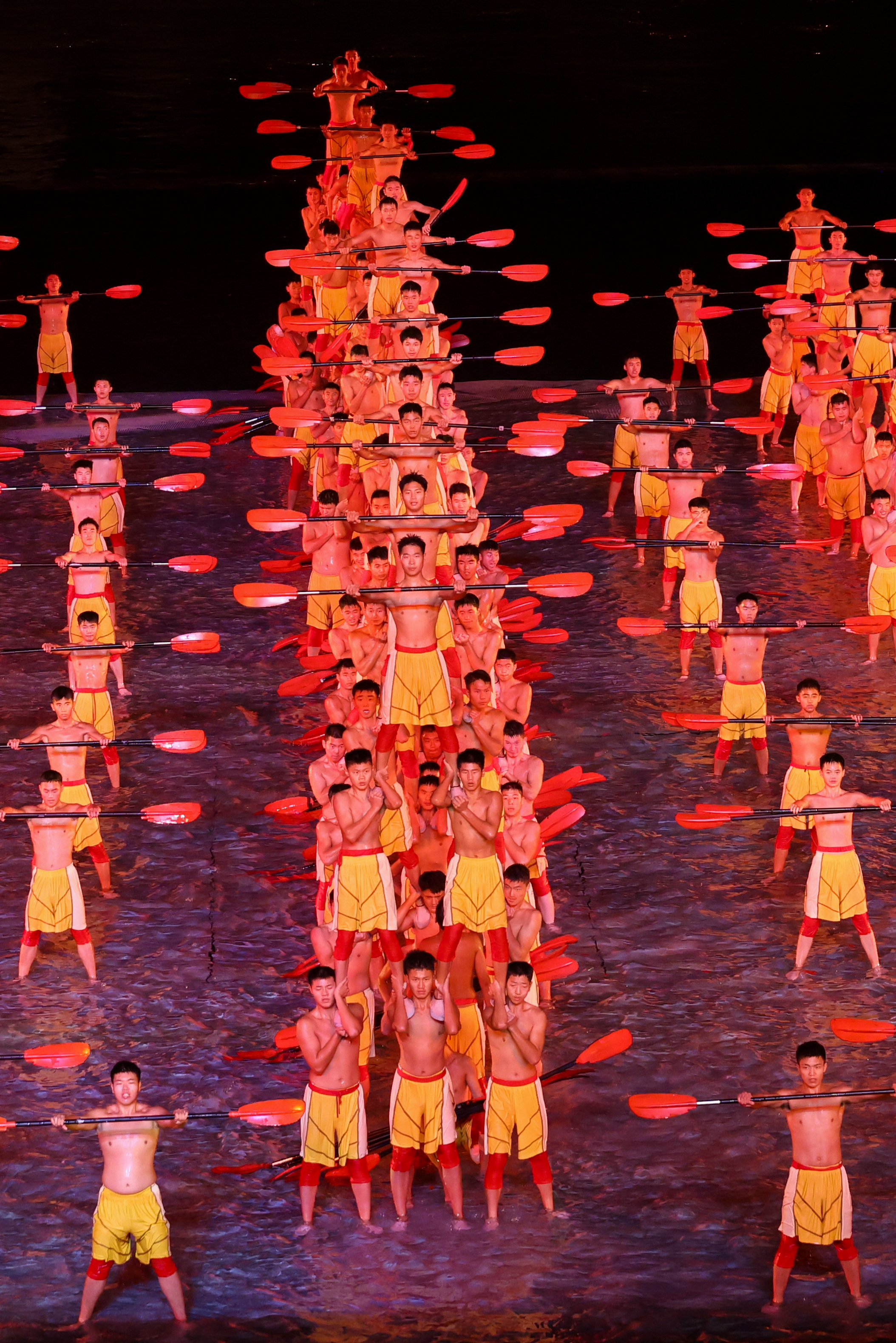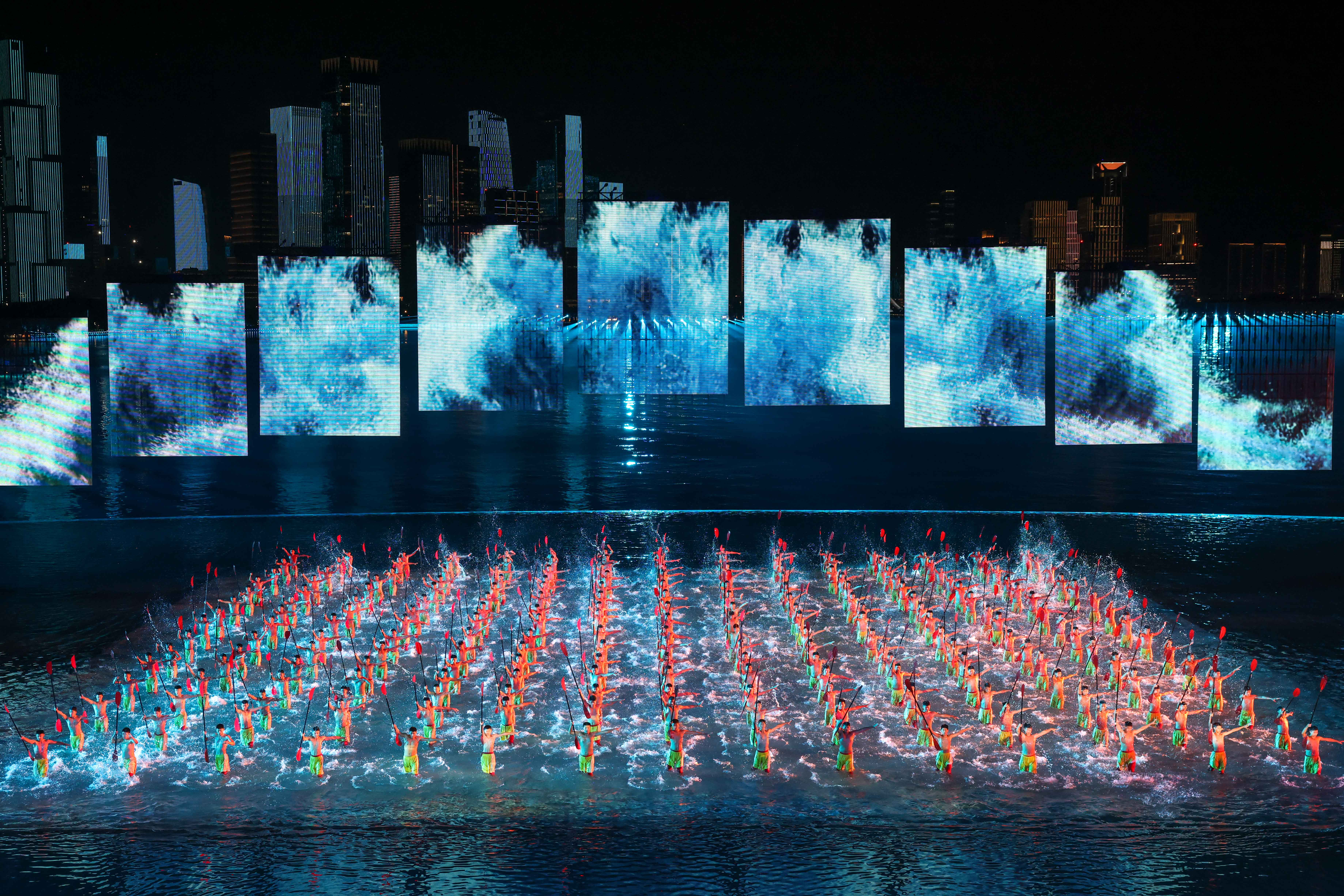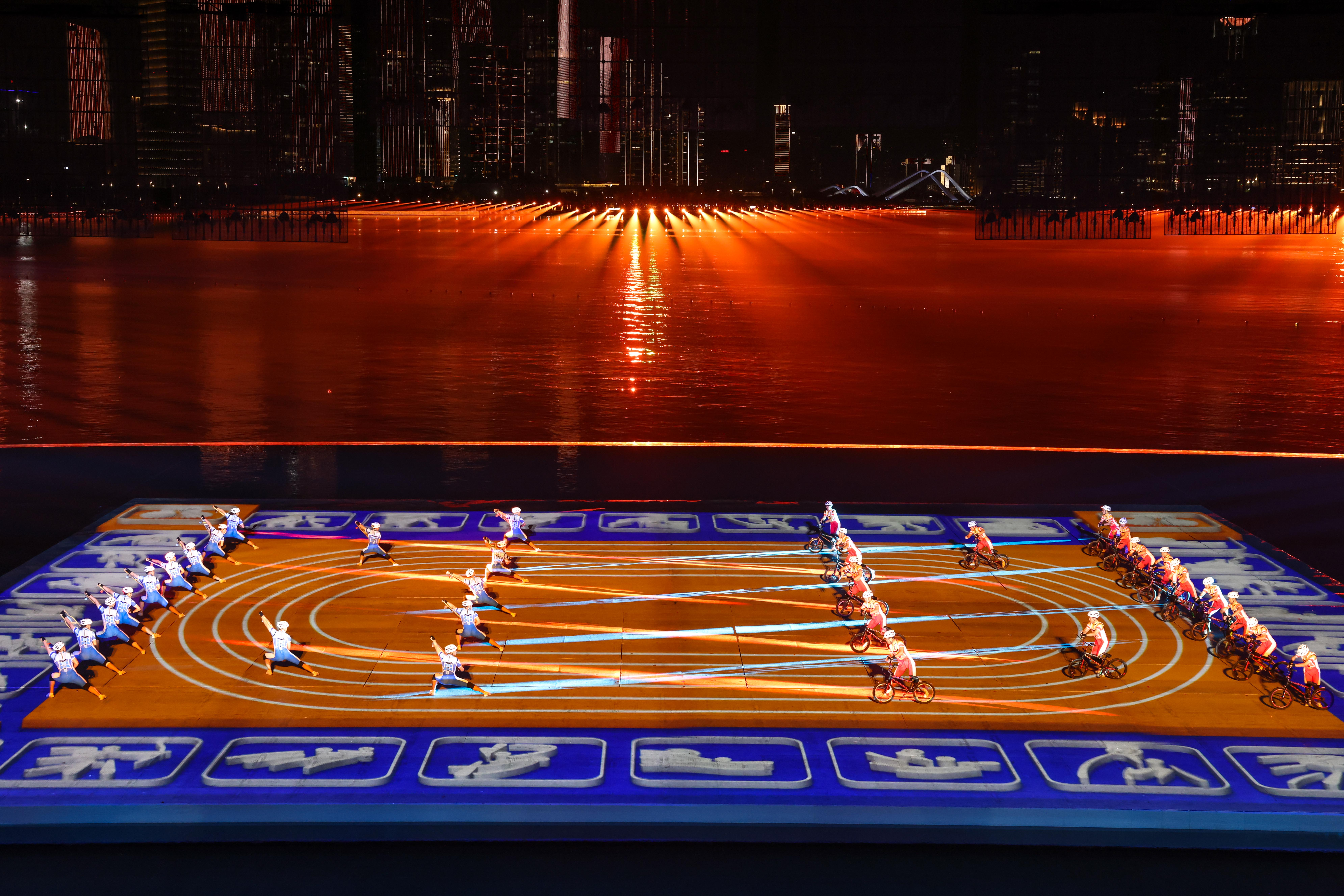 本届全运会闭幕式以“星辰大海”为主题,巧妙融合海天幕景与城市风光,打造出六个意境深远的表演段落。其中,段落四《巅峰的时刻》无疑是全场最大亮点——舞台首次实现完全沉入水中,225名功夫小子化身“中华龙舟队”踏浪登场,以气势磅礴的功夫动作模拟龙舟竞渡,他们刚劲有力的拳脚、整齐划一的阵型展现出运动之美、速度之美与力量之美;节目尾声,学员们迅速叠起三层人塔,勾勒出栩栩如生的“中华龙舟”造型,生动诠释了大湾区同心协力、奋勇争先的时代精神,引得现场掌声雷动。