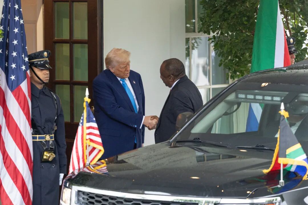 5月21日,美国总统特朗普(左二)在华盛顿白宫迎接到访的南非总统拉马福萨。新华社记者胡友松摄